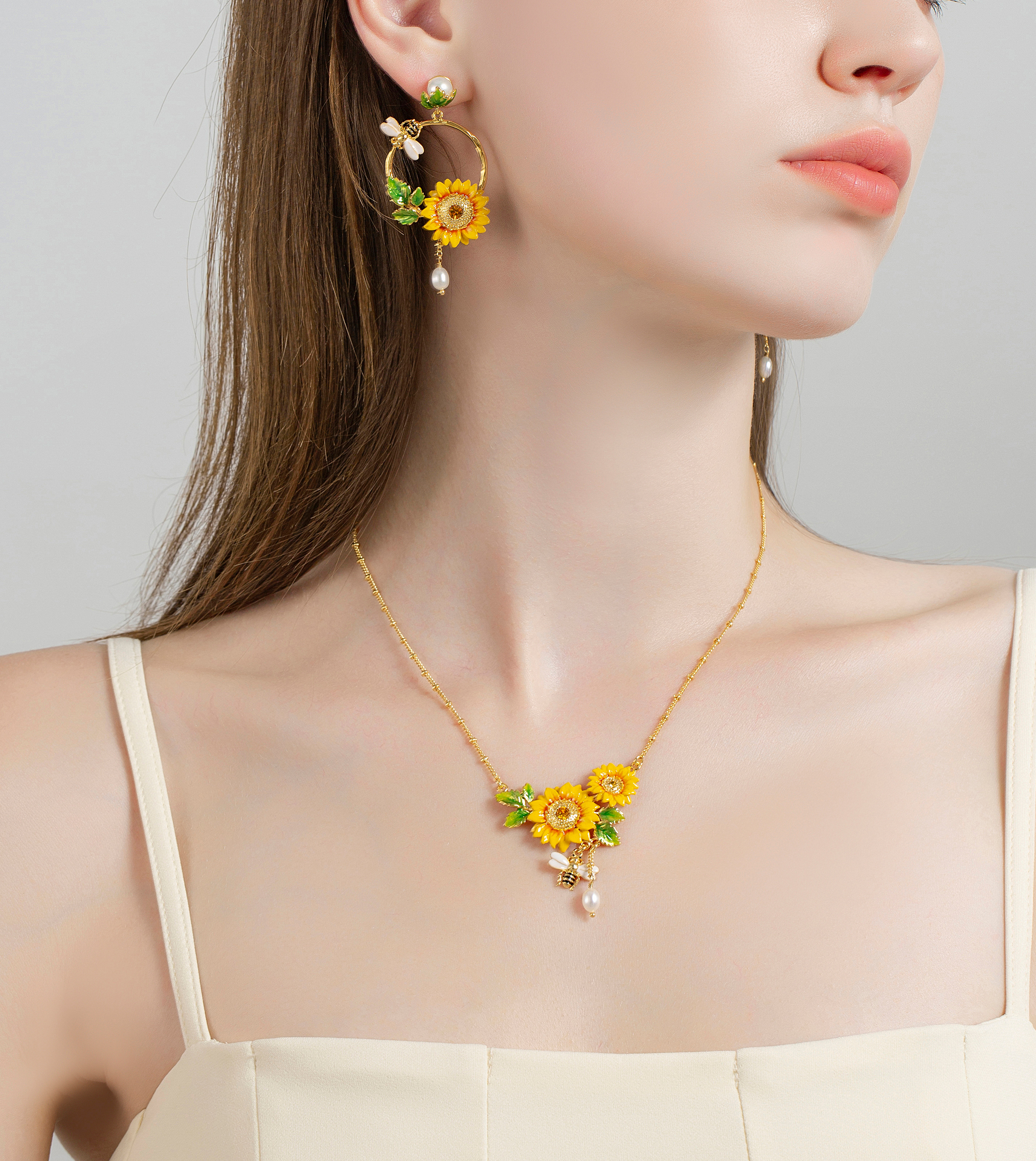 18K Bee Sunflower Leaf Circle Pearl Enamel Earrings