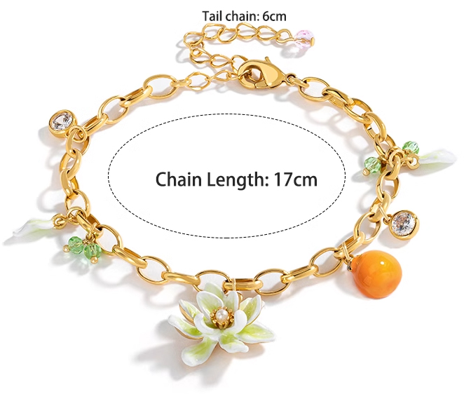 This bracelet consists of three elements: gardenia, petal and orange. The stamen is made of freshwater pearl, emitting a soft luster. And the bracelet is embellished with shimmering zirconia, like stars dotting the night sky, adding a touch of magnificence to the whole bracelet.